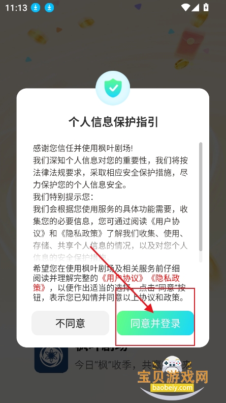 1、在宝贝游戏网下载安装枫叶剧场手机版,点击同意并登录