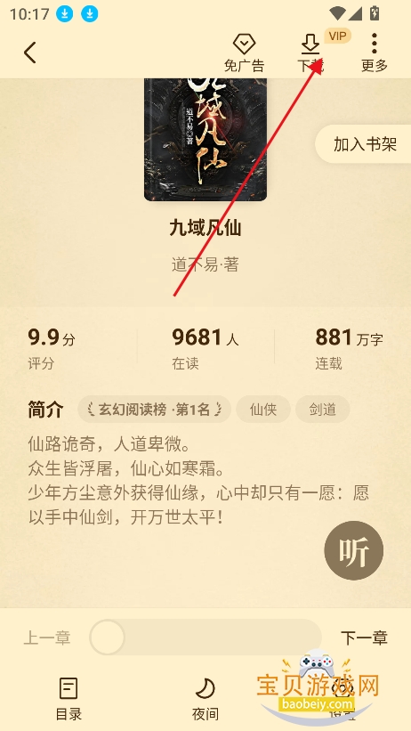 进入喜欢的小说界面,点击屏幕,上方点击下载按钮