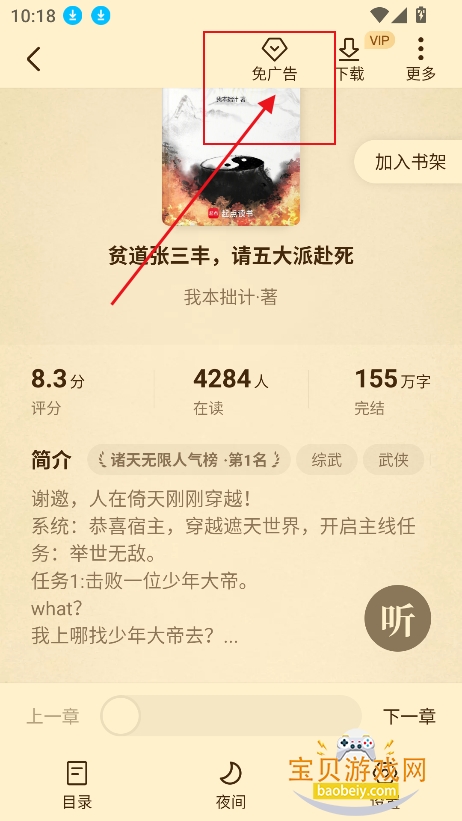 直接点击阅读界面的免广告按钮,就可以去除广告弹窗,纯净阅读小说