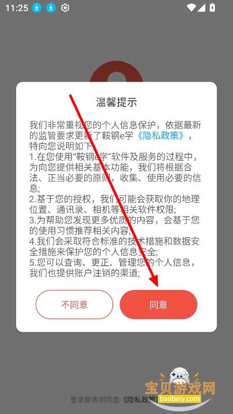 在宝贝游戏网下载安装鞍钢e学app安卓版,点击“同意”进入