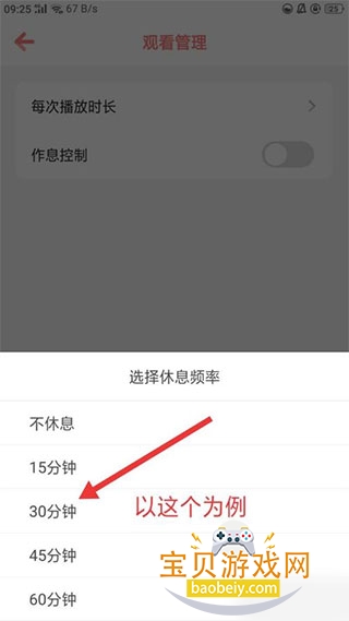4、然后下面弹出选择休息频率对话框,这里以选择30分钟为例,点击该选项。