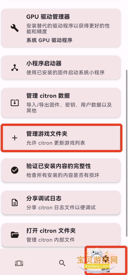 3、之后来到软件点击有右下方的设置,下滑找到【管理游戏文件夹】,进去后点击右下角的【+】号。