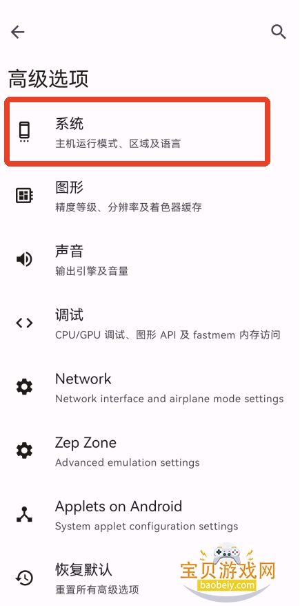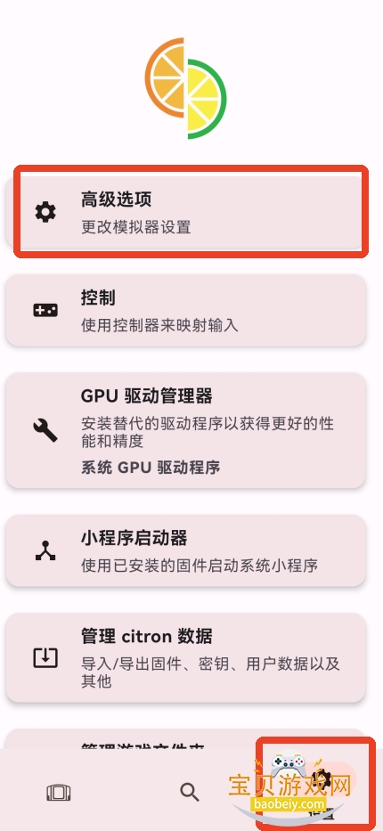 1、在软件的【设置】页面选择第一个【高级选项】,这里面可以更改模拟器的各种设置。