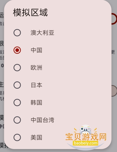 3、找到【模拟区域】,在弹出来的选项中选择【中国】。