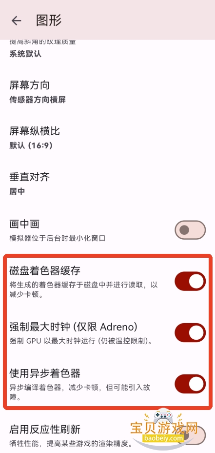 8、接着再来到【高级选项】-【图形】,下滑找到【使用异步着色器】点击旁边的滑块打开,上面那个【强制最大时钟】也可以打开。打开这三个可以让游戏更加流畅。