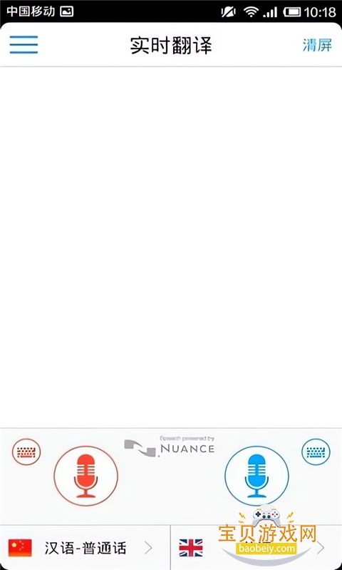 2、进入首页后,是一个很简单的页面,下面两个麦,上面就是记录屏,麦下方能选择你使用什么语言,右边是翻译的语言,其实这两个功能有点重复。