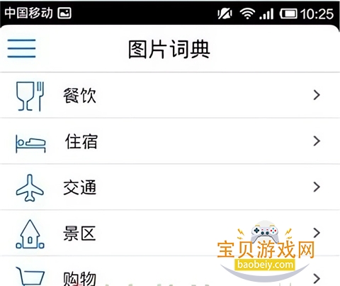 5、先看看图片词典,可以看到餐饮住宿交通景区购物的选项,这些都是挺有用,旅游平常会用到的。