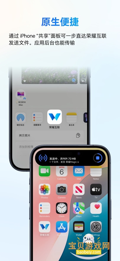 -5.原生便捷分享:苹果设备可在分享面板直接调用荣耀互联,无需先打开APP,一键发起文件分享,操作更省心。