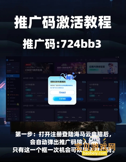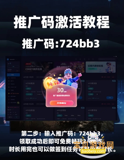 第二步:输入推广码:724bb3,领取成功后即可免费畅玩3A大作,时长用完也可以做签到任务领取免费时长。