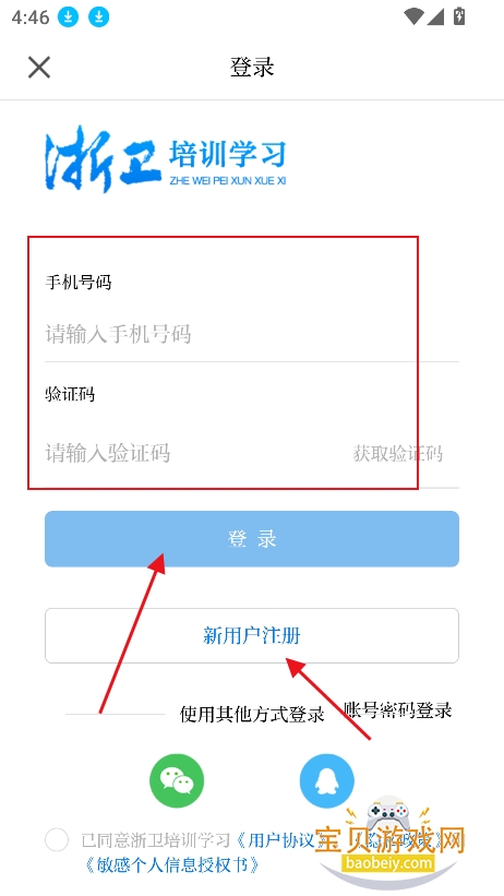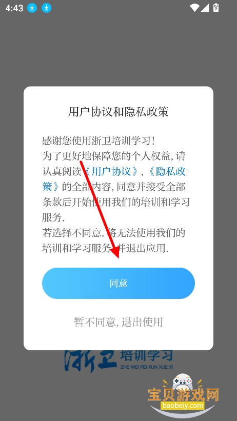1、在宝贝游戏网下载安装浙卫培训学习app安卓版,点击同意进入
