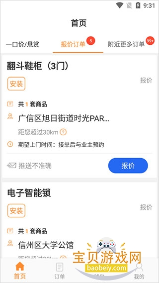 工奇兵师傅端提供多种维修服务的订单,包括锁具、更换卫浴设备、安装晾衣架和淋浴房等。丰富的订单类型使得不同技能的师傅都能找到适合自己的工作机会。