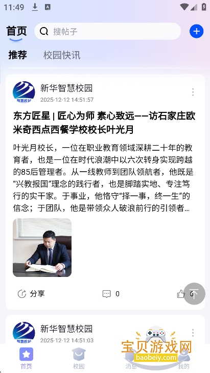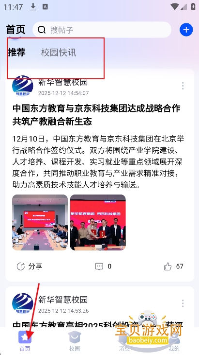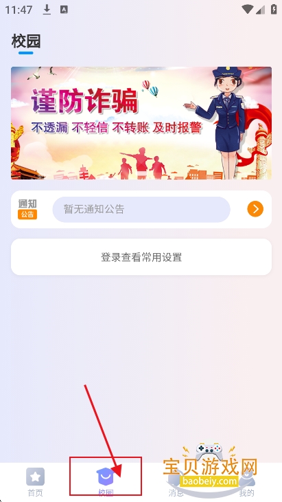 2、进入校园板块,可以查看最新校园公告,和常用功能