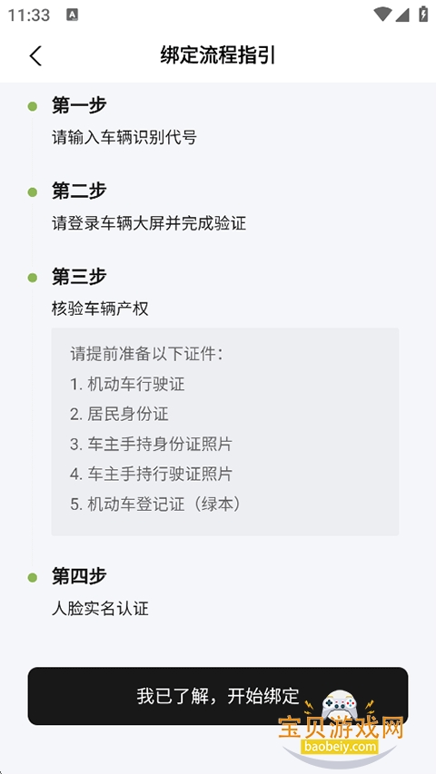3、输入需绑定车辆的识别代号(VIN码)后点击下一步,继续车辆大屏验证、核验产权以及人脸实名认证,直到绑定成功。