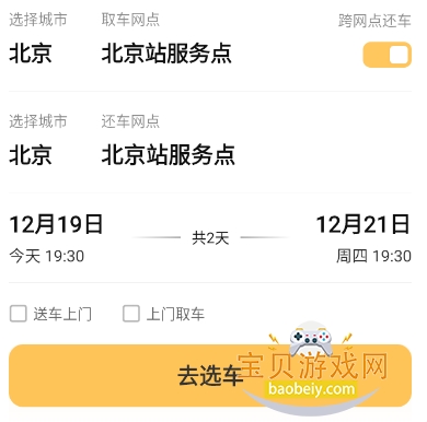 2、输入取/还车信息后点击【去选车】。