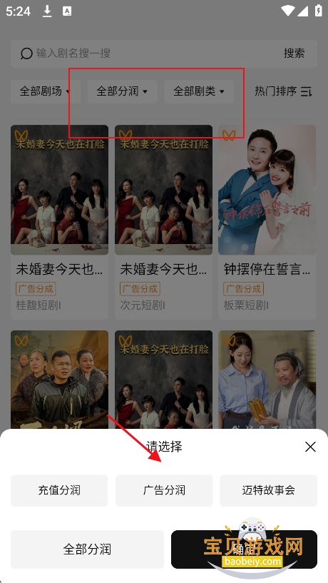 2、或者让进入短剧板块,可以根据分成,利润,以及剧类筛选你想要推广的短剧