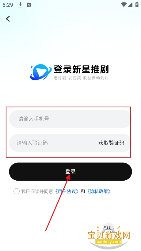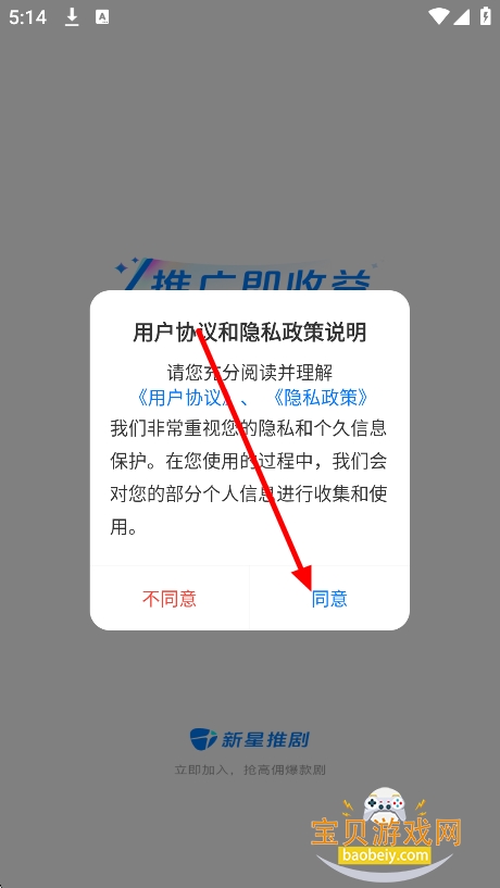 1、在宝贝游戏网下载安装新星推剧手机版,点击“同意”进入