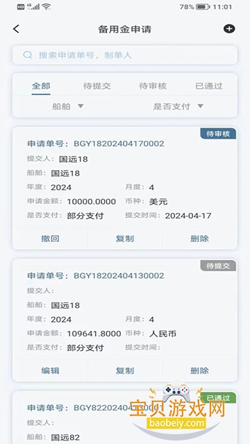申请审批支持招待费申请、购物申请、合同、会签、程租、期租、包运以及用章申请等审批流的查看、审批功能;
