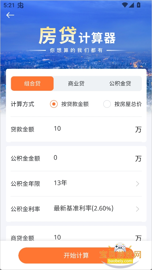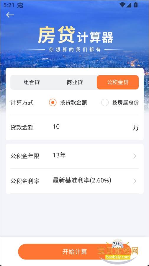 4、以公积金贷款为例,填写好相关信息后,点击页面下方的“开始计算”。