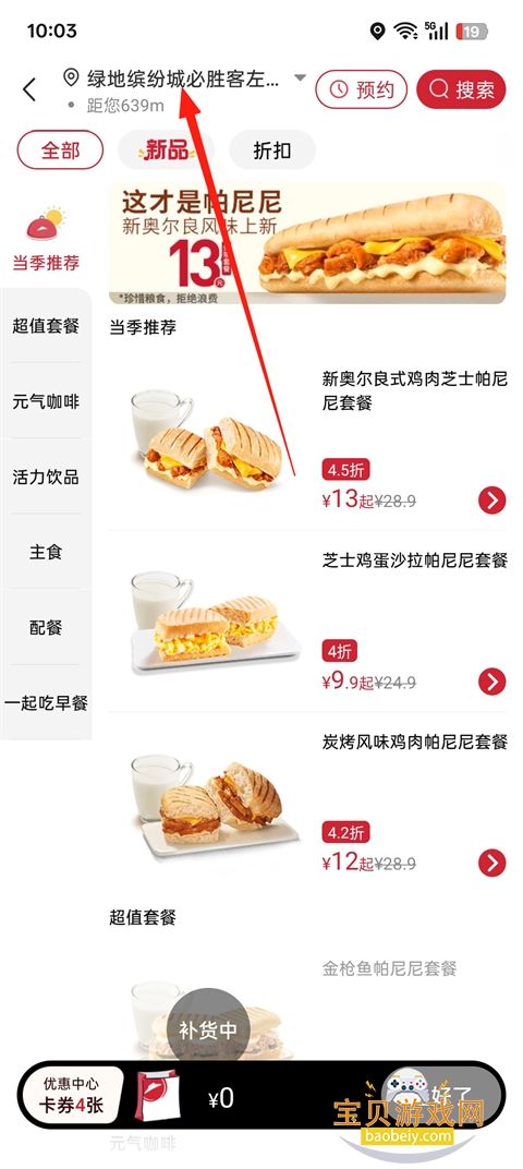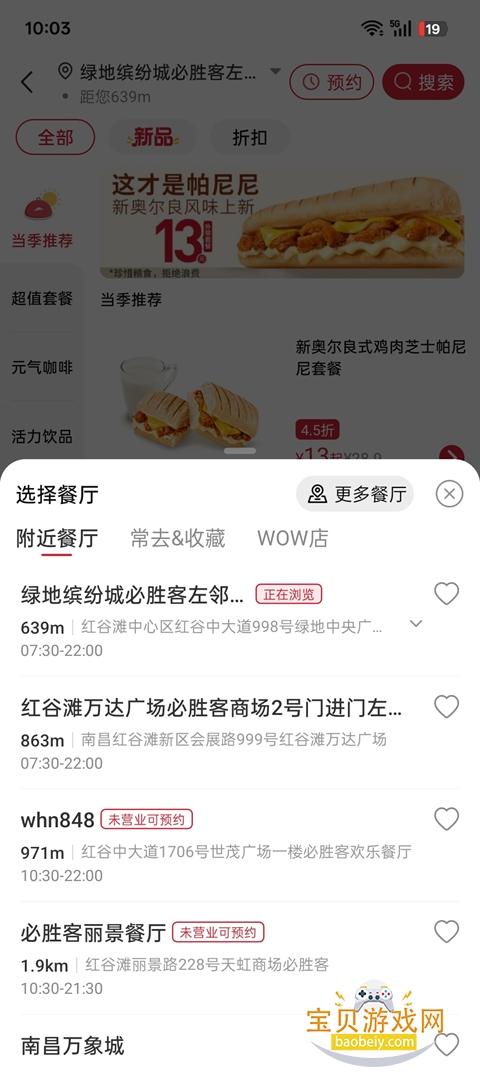 2、然后开始点餐,软件会定位到用户附近的必胜客餐厅,如果想要切换餐厅,点击餐厅