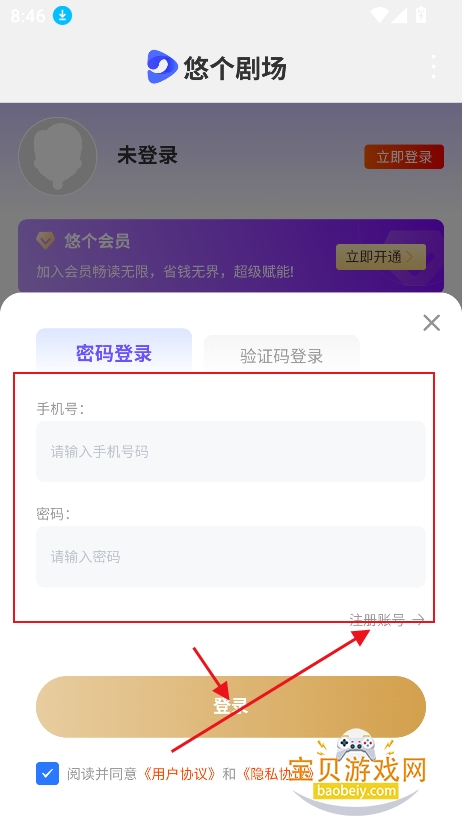 2、进入登录界面,支持账号密码登录,或者手机号验证登录