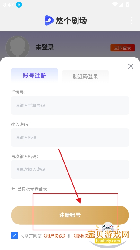 3、新用户,直接点击注册账号,进入注册界面,输入基本信息完成注册