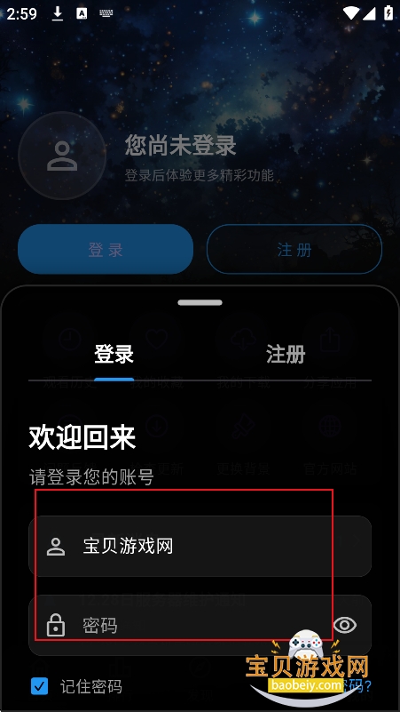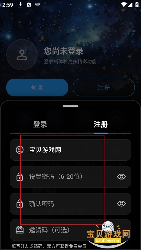 3、新用户直接点击注册进入注册界面,任意输入账号密码,无需验证,邀请码选填即可,就可以成功注册
