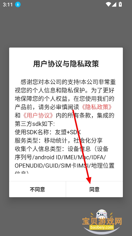 1、在宝贝游戏网下载安装酵母君app手机版,点击“同意”进入