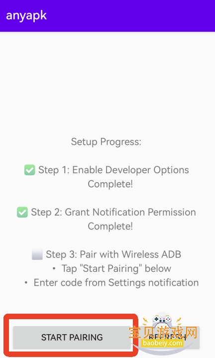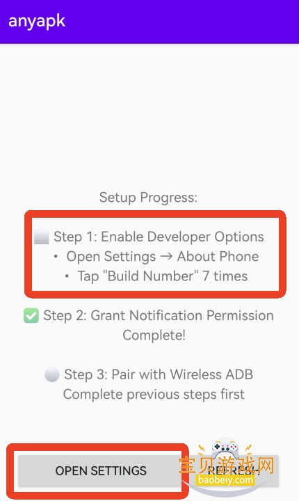 4、之后回到anyapk软件内可以看到我们的第一步前面有了绿色的√。接下来就是开始第三步,与无线ADB配对。再次点击左下的【OPEN SETTINGS】。