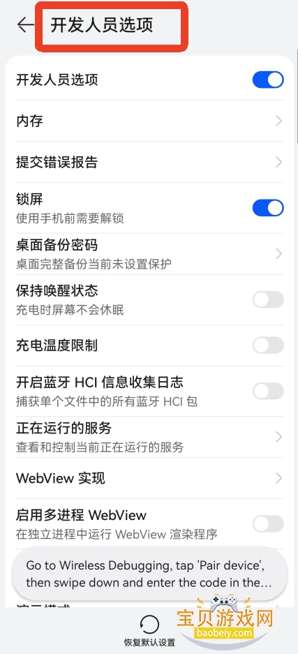5、会跳转到【开发人员选项】,找到并勾选“启用无线调试”选项。根据提示,允许当前连接的WiFi网络,查看配对码和端口。