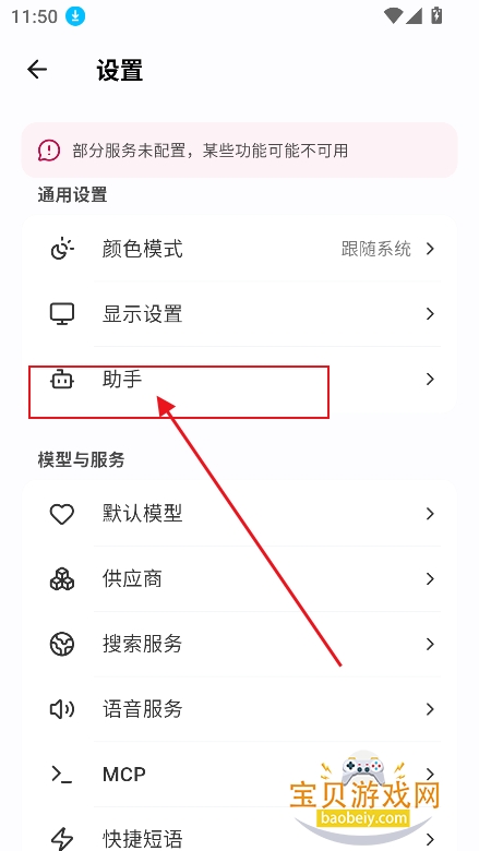 1、进入设置界面,点击助手
