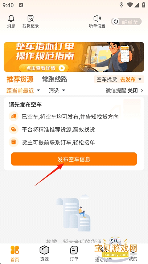 在首页点击推荐货源-发布空车信息,完成后下方会显示各种货源,点击合适的去接单即可。