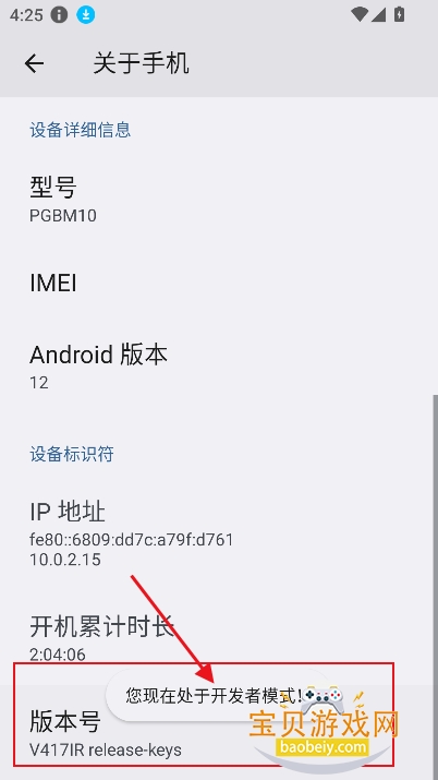 3、点击版本号7次,直到出现开发者选项