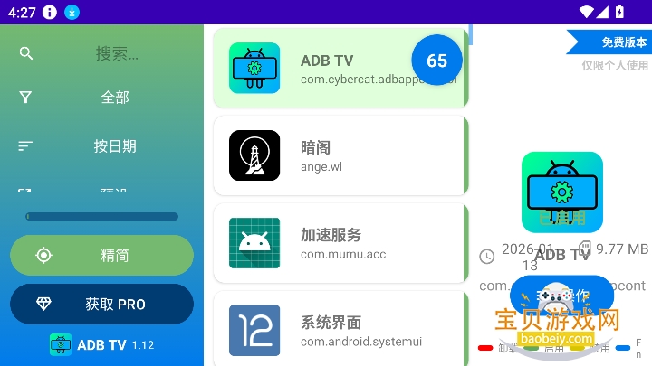 ADB TV版下载2026最新版,一款专业的adb调试工具,软件基于ADB调试功能开发,能够直接禁用或卸载电视系统的应用,有效释放存储空间、提升系统运行流畅度,减少不必要的广告干扰。同时支持按名称、安装日期、文件大小等多维度对应用进行排行筛选,方便快速定位目标应用;还内置屏幕分辨率管理功能,满足用户个性化显示需求,是优化电视使用体验、高效管理电视应用的实用工具。需要的欢迎来宝贝游戏网下载使用哦!