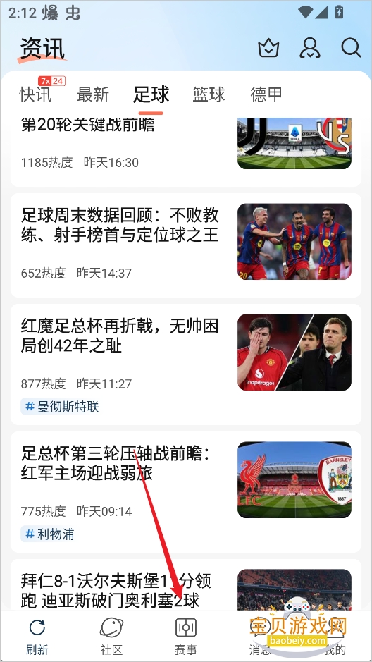 1、打开球探体育比分App,在底部导航栏中进入【赛事】页面。