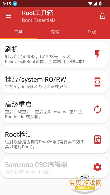 ROOT工具箱3.5高级版下载,是一款专为安卓Root用户打造的全能手机管理工具,核心定位为通过系统化的功能模块,帮助用户深度管理手机设备、优化系统体验。软件功能全面且分类清晰,核心分为工具、存储、外观三大功能模块,涵盖电池校准、刷机、应用管理、个性化美化等多元实用功能。作为汉化版本,其界面全程中文显示,彻底解决了原版英文界面的使用门槛,所有功能一目了然,操作直观便捷,无需专业技术知识也能轻松上手,是Root设备用户深度操控手机、提升使用体验的必备工具。