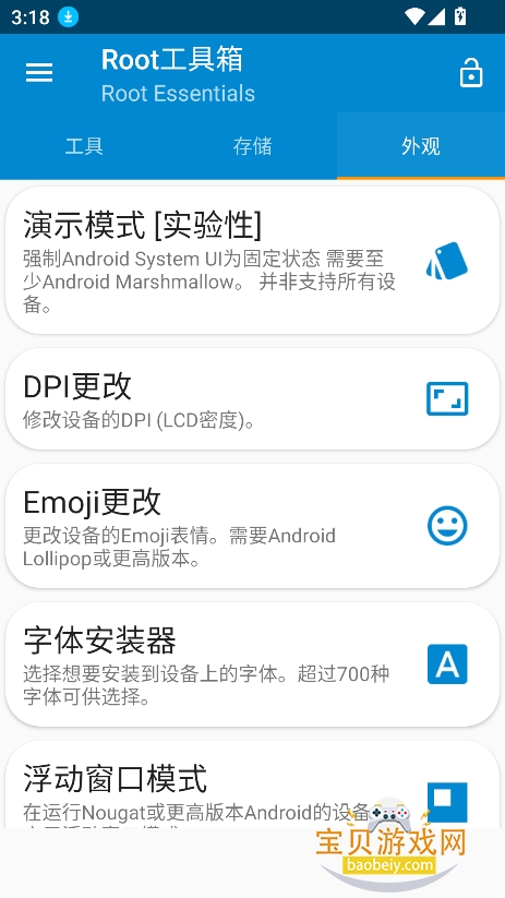 3.外观模块:个性化定制与美化:主打手机界面个性化改造,支持修改设备表情、字体、语言等核心功能。字体安装器提供超过700种字体可供选择,用户可自由挑选并安装心仪字体,替换系统默认字体,打造专属文字风格;Emoji更改功能可替换设备默认的表情样式,让聊天互动更具个性;支持系统语言更改,适配不同语言使用需求;此外还包含DPI更改功能,可调整设备显示密度,优化界面视觉体验。