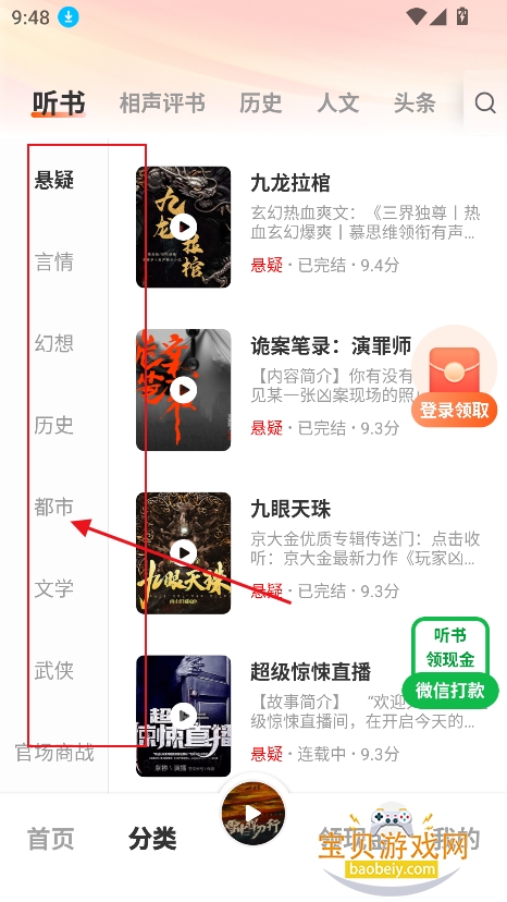1、进入【首页】,首先筛选喜欢听书的类型,相声,有声小说,历史,人文一应俱全