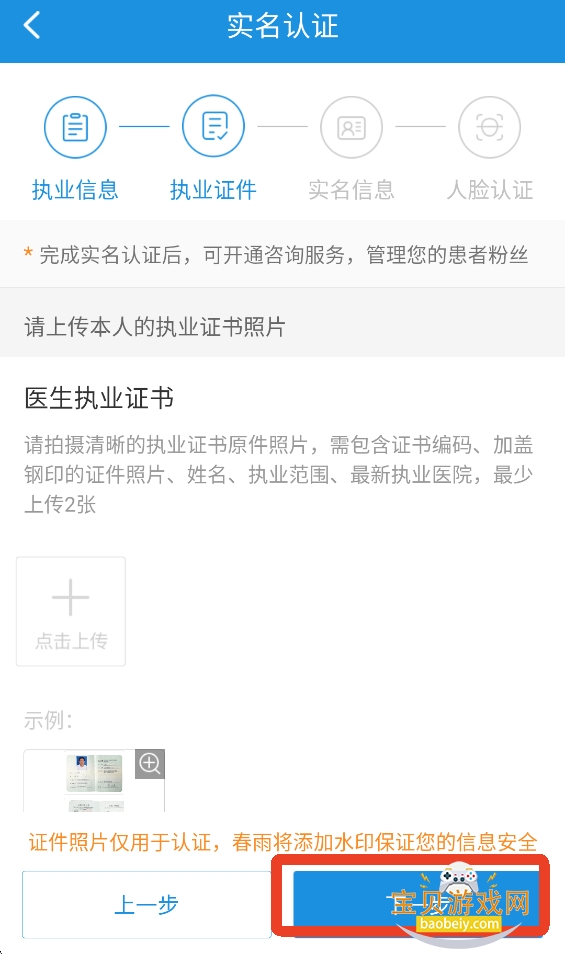 4、上传i的医生执业证书和职称证书,注意上传照片的要求,然后点击下一步。