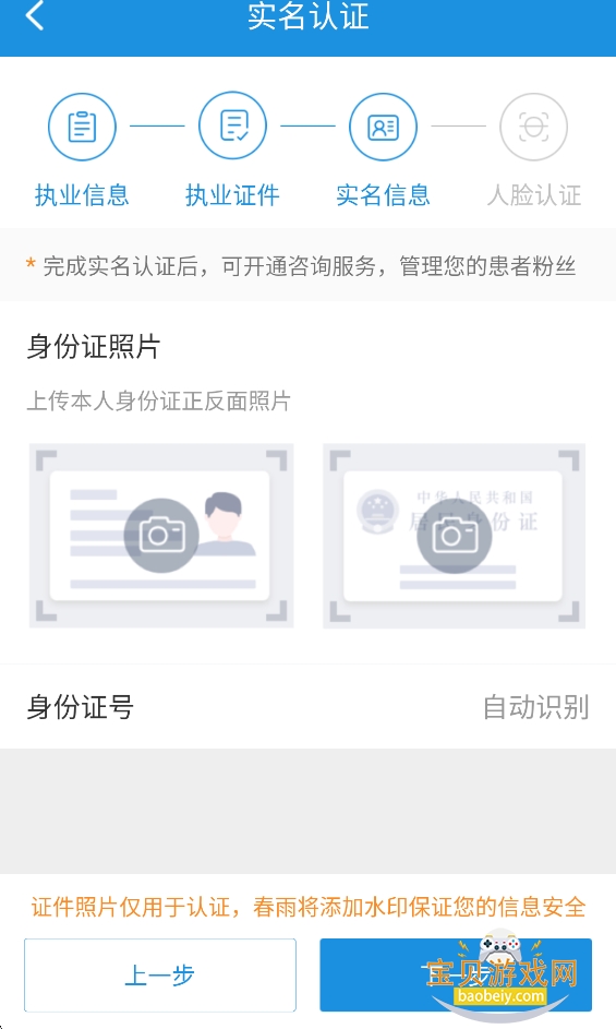 5、接下来就是上传本人的身份证正反面照片以及身份证号,点击下一步进行人脸认证就完成了注册的步骤。完成实名认证后才能开通咨询服务。