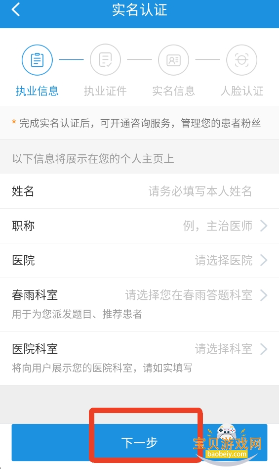 3、之后就是填写你的姓名、职称、医院、科室,填写完毕点击【下一步】。