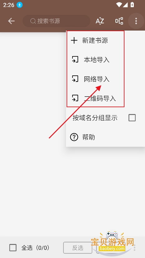 4、选择导入方式,支持本地导入,网络导入,新建书源,以及二维码导入等