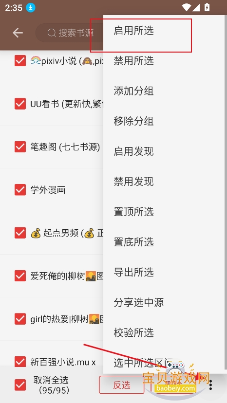 6、勾选需要的书源,点击【启用所选】即可