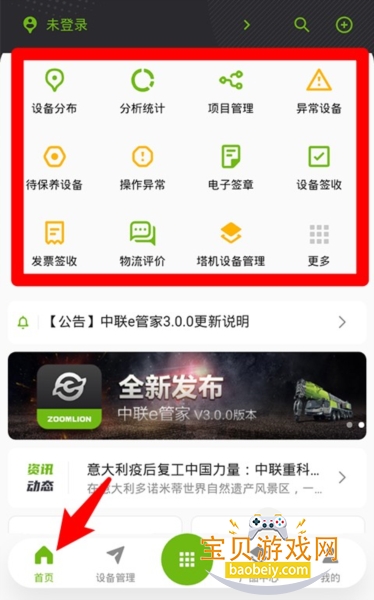 1、在首页可查看设备分布、统计分析、异常设备、签收管理等常用功能模块入口。