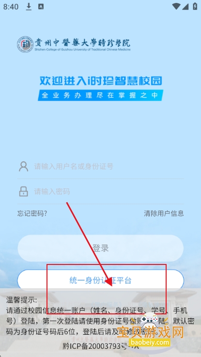 2、进入登录界面,点击统一身份认证平台