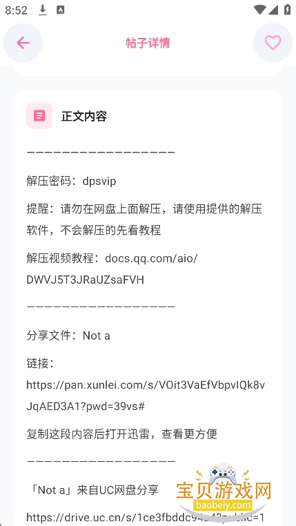 6、然后进入喜欢的帖子界面,往下浏览,提供网盘地址,密码等,可以直接下载到本地