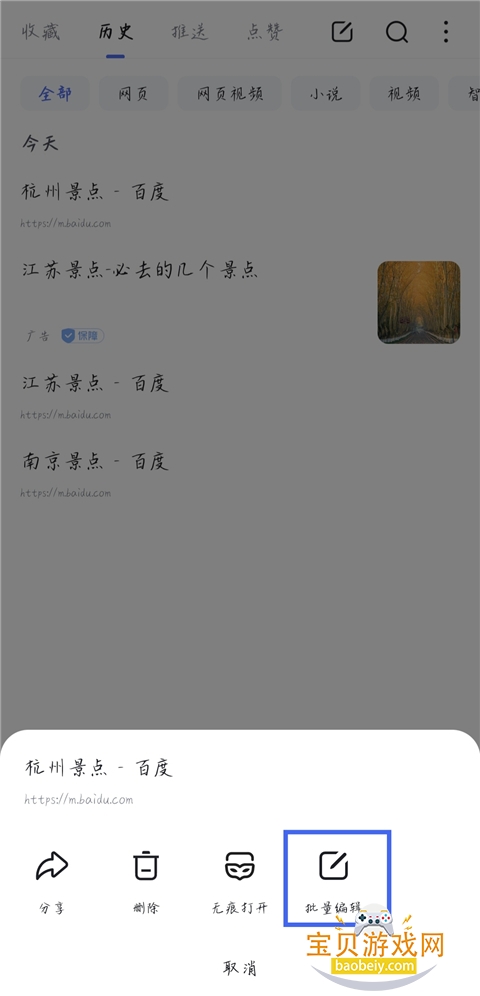 2、长按历史搜索记录,点击【批量删除】。