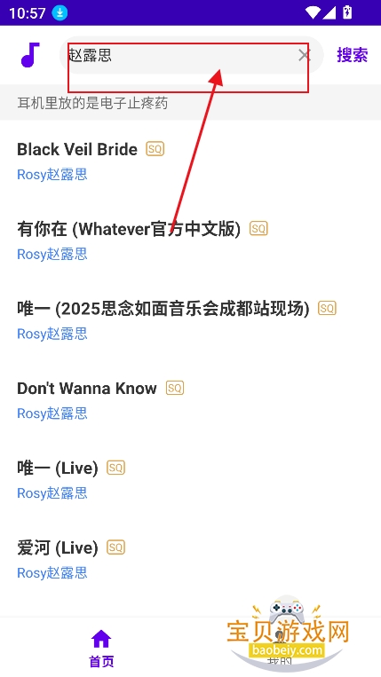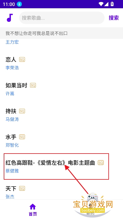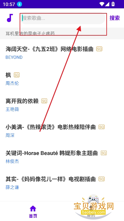 1、进入首页,可以上下浏览,筛选喜欢的音乐,或者直接点击搜索框,输入歌手名,歌曲名,精准检索