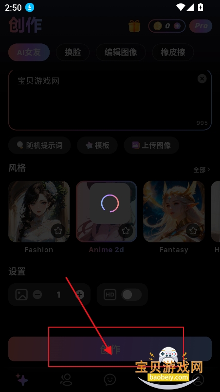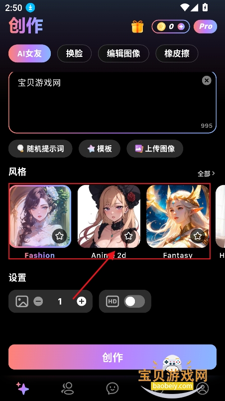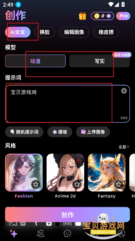 2、选择动漫,或者写实风格,然后再文本框输入关键词描述,然后选择风格