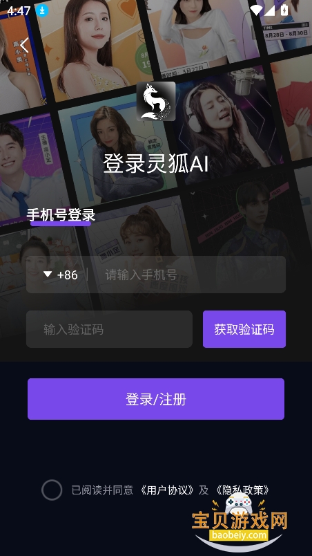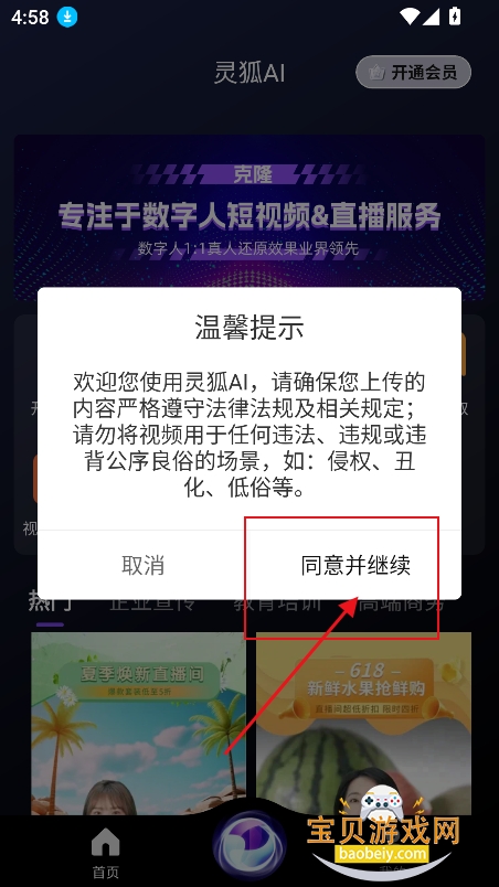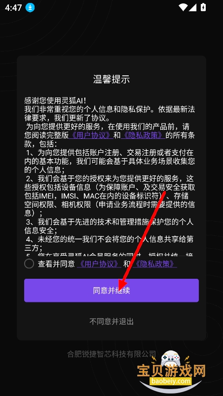 1、在宝贝游戏网下载安装灵狐AI软件安卓版,点击【同意并继续】进入
