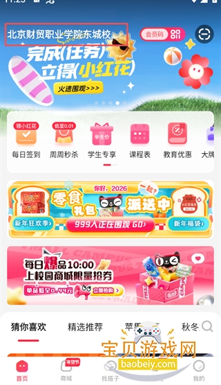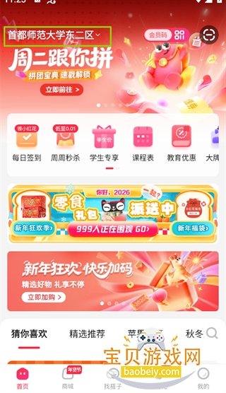 1、打开天猫校园App首页,点击顶部当前显示的学校名称。